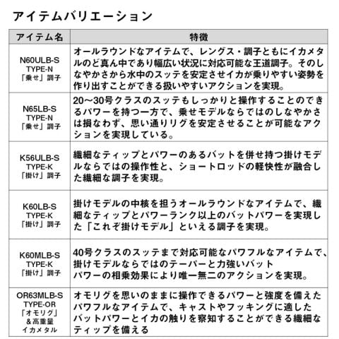 イカメタルの基本調子となる乗せモデル(N)、攻めの釣りを実現する掛けモデル(K)、年々シェアアップしているオモリグ(OR)で全国のフィールドに対応。