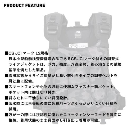 CS JCIマークの入ったライフジャケット(固型式)は、浮力・強度・水上での性能(浮遊姿勢など)・着心地等の試験基準を満たしたライフジャケットです。