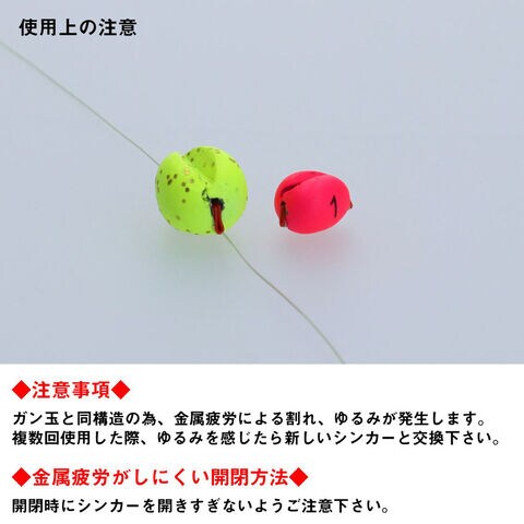 ※ガン玉と同構造の為、金属疲労による割れ、ゆるみが発生します。複数回使用した際、ゆるみを感じたら新しいシンカーと交換下さい。