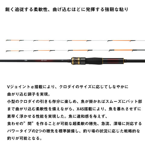 Vジョイントα搭載により、クロダイのサイズに応じてしなやかに曲がり込む調子を実現。