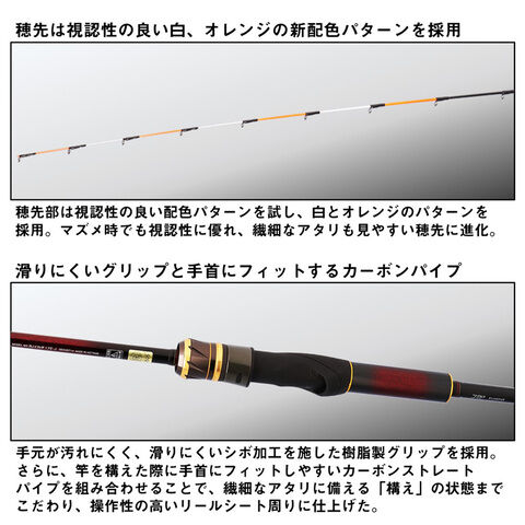 ダイワ史上最も柔軟な食わせタイプと、急流、深場、高活性時といったシチュエーションでシャープな操作が可能な掛けタイプの2つの穂先を標準装備。
