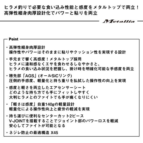 食い込み性能と手感度の良さが魅力のメタリアヒラメが高弾性細身肉厚設計化でパワーと粘りを両立してモデルチェンジ。
