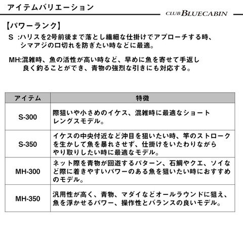 MH・・・混雑時、魚の活性が高い時など、早めに魚を寄せて手返し良く釣ることができ、青物の強烈な引きにも対応する。