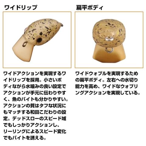 ワイドアクションを実現するワイドリップを採用。小さいボディながら水噛みの良い設定でアクションが手元に伝わりやすく、魚のバイトも分かりやすい。