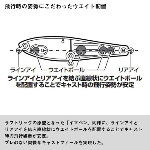 ラインアイとリアアイを結ぶ直線状にウエイトボールを配置することでキャスト時の飛行姿勢が安定し、ブレのない爽快なキャストフィールを実現した。