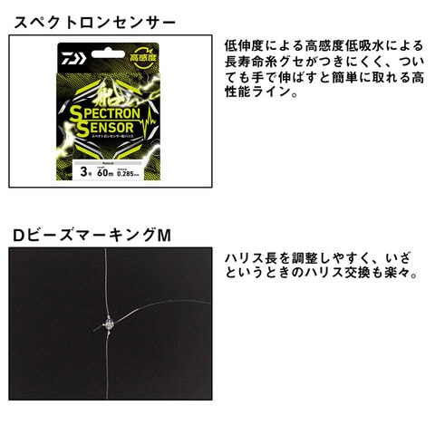 ラインには張りがあり低比重、低伸度な高感度ライン「スペクトロンセンサー」を採用しわずかな触れるようなアタリも竿先に伝える。