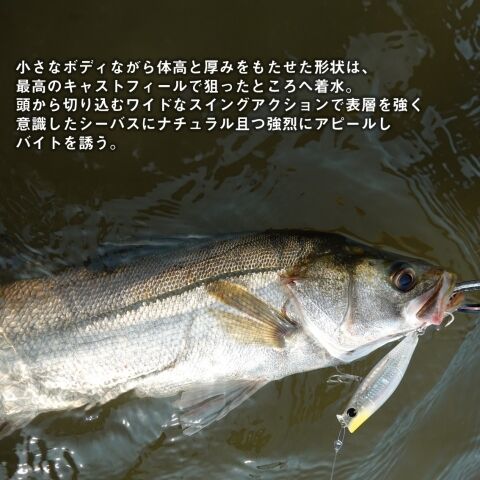 頭から切り込むワイドなスイングアクションで表層を強く意識したシーバスにナチュラル且つ強烈にアピールしバイトを誘う。