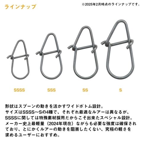 形状はスプーンの動きを活かすワイドボトム設計。サイズはSSSS~Sの4種で、それぞれ最適なルアーは異なるが、SSSSに関しては特殊素材採用だからこそ出来たスペシャル設計。