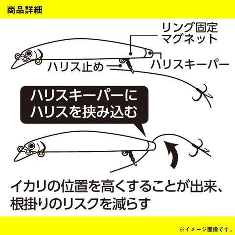 後方に軟質材で出来たハリスキーパーがあり、そのハリスキーパーにハリスを挟み込むことにより、イカリの位置を高くし、根掛りのリスクを減らし、浅場攻略が可能。