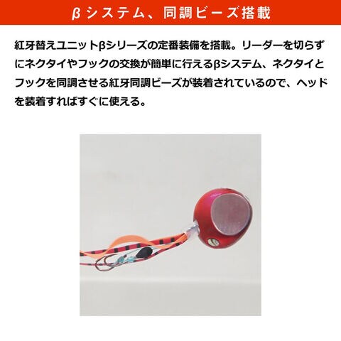リーダーを切らずにネクタイやフックの交換が簡単に行えるβシステム、ネクタイとフックを同調させる紅牙同調ビーズが装着されているので、快適に釣りが楽しめる。