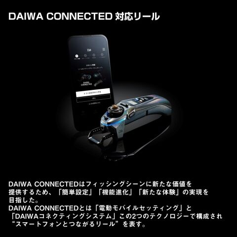 DAIWA CONNECTEDとは「電動モバイルセッティング」と「DAIWAコネクティングシステム」この2つのテクノロジーで構成され“スマートフォンとつながるリール”を表す。