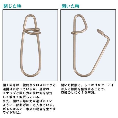 開いた状態で、しっかりルアーアイが入る隙間を確保することで、従来品の交換のしにくさを解消。