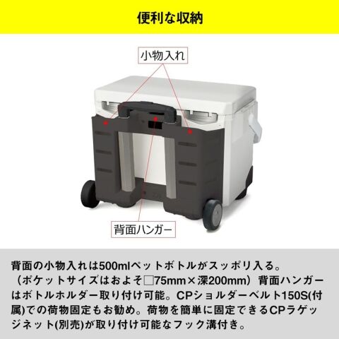 背面の小物入れは500mlペットボトルがスッポリ入る。(ポケットサイズはおよそ□75mm×深200mm)背面ハンガーはボトルホルダー取り付け可能。