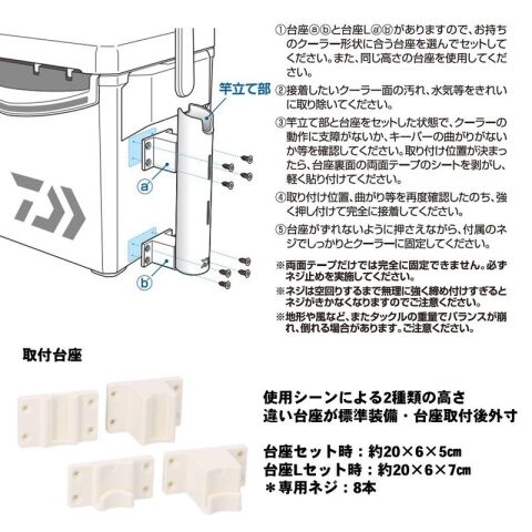 1.台座abと台座L@Bがありますので、お持ちのクーラー形状に合う台座を選んでセットしてください。また、同じ高さの台座を使用してください。
