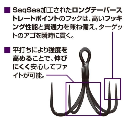 SaqSas加工を施したロングテーパーストレートポイントフックを採用し、高いフッキング性能と貫通力でターゲットのアゴを瞬時に貫く。