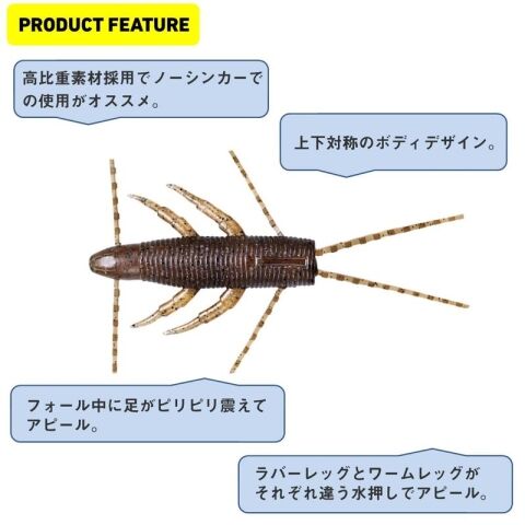 ラバーレッグとワームレッグがフォール時にそれぞれ異なる波動でアピールし、エビ喰い系のバスに特に威力を発揮する。