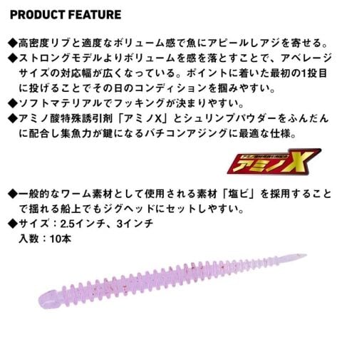 アミノ酸特殊誘引剤「アミノX」とシュリンプパウダーをふんだんに配合し集魚力が鍵になるバチコンアジングに最適な仕様。