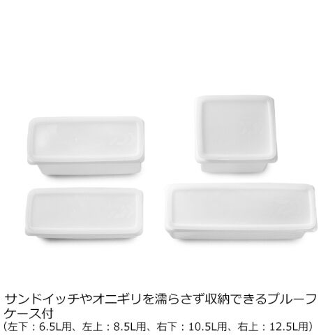 サンドイッチやオニギリを濡らさず収納できるプルーフケース付(左下:6.5L用、左上:8.5L用、右下:10.5L用、右上:12.5L用)。