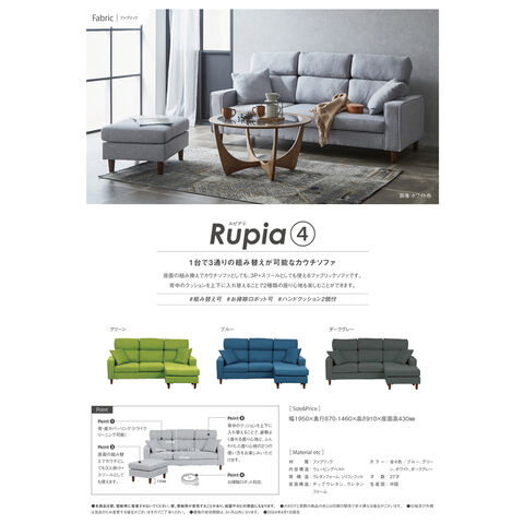 座面の組み換えでカウチソファ、3P+スツールとして使えるファブリックソファです。
