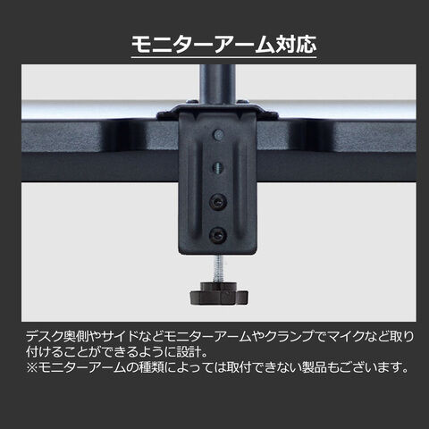 デスク奥側やサイドなどモニターアームやクランプでマイクなど取り付けることができるように設計。