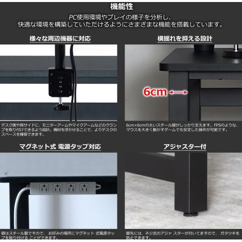 - 機能:ワイドケーブル配線ノッチ/モニターアーム対応/磁石付き電源タップ対応