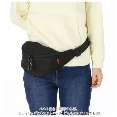 バックル式ベルトで装着もスムーズ。ベルト長さを調節すれば、ボディバッグとウエストバッグ、どちらのスタイルでもOK!