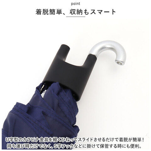 U字型のカラビナ金具を軽くひねってスライドさせるだけで着脱が簡単!