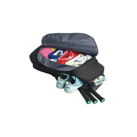 ◆シューズポケット、チェストベルト、撥水、YKKファスナー、天マチポケット、ラケット3本収納部屋。