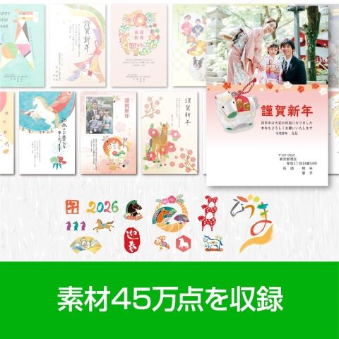 ■年賀状ソフト最多の素材45万点2026年の干支、うま年のデザインだけでなく、十二支デザインや名刺やラベルなどさまざまなデザインを収録しています。