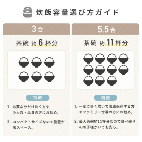 - 付属品:計量カップ、計量カップ(無洗米用)、しゃもじ、しゃもじ(おかゆ用)、電源コード
