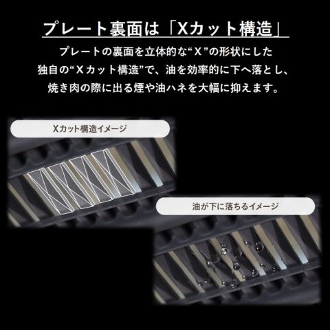 プレートの裏面を立体的な"X"の形状にした独自の"Xカット構造"で、油を効率的に下へ落とし、焼き肉の際に出る煙や油ハネを大幅に抑えます。