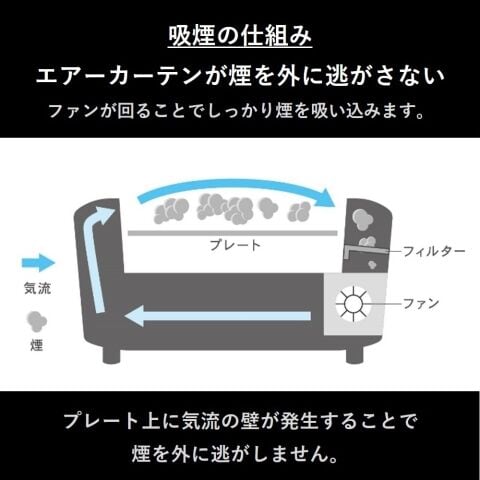 プレートの上に気流の壁が発生することで煙を外に逃がしません。