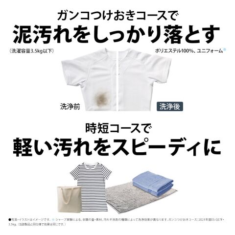 ガンコつけおきコースを搭載。つけおきで汚れが落ちやすくなり、標準コースよりしっかり洗いたいときに便利です。(洗濯容量3.5kg以下)