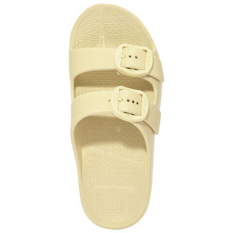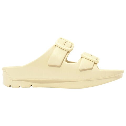 ホールド力の高いWストラップとぽってりした厚底が特徴。