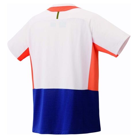 バドミントンのゲームシャツは伸び方向の違うパーツを脇下へ配置することでウェアの突っ張り感が解消され、動きやすい独自形状。