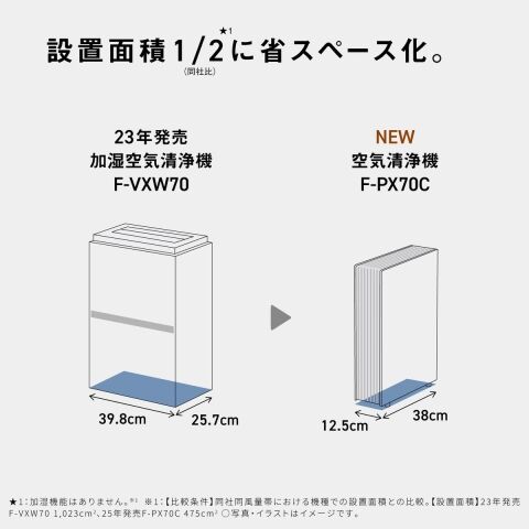 *【比較条件】同社同風量帯における機種での設置面積との比較。【設置面積】23年発売F-VXW70 1023cm2、25年発売F-PX70C 475cm2