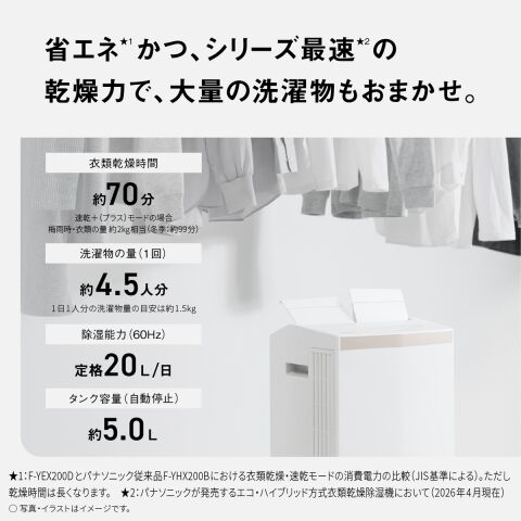 *1 F-YEX200Dとパナソニック従来品F-YHX200Bにおける衣類乾燥·速乾モードの消費電力の比較(JIS基準による)。ただし乾燥時間は長くなります。