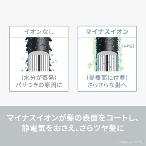 マイナスイオンが髪の表面をコートし、静電気をおさえ、さらツヤ髪に