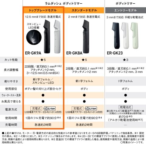 - 付属品:肌ガードアタッチメント(2mm)、長さそろえアタッチメント(3~12.5mm)、充電ケーブル、掃除用ブラシ、専用オイル、ポーチ