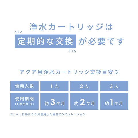 - カートリッジ交換の目安(1人1日平均8分浴びた場合):[1人で使用]約3か月 [2人で使用]約1.5か月 [3人で使用]約1カ月
