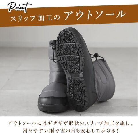 アウトソールにはギザギザ形状のスリップ加工を施しており、滑りやすい雨や雪の日も安心。
