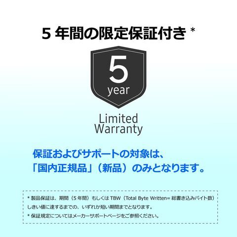 メーカー保証期間 5年 製品保証は、期間(5年間)もしくはTBW(Total Byte Written=総書き込みバイト数)しきい値に達するまでの、いずれか短い期間までとなります。