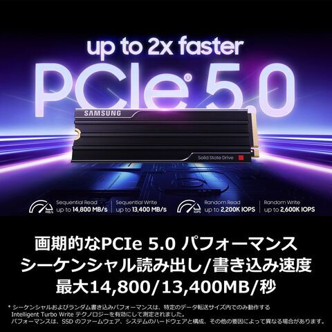 PCIe 5.0のパフォーマンスを最大限に引き出します。 9100 PRO with Heatsinkは、990 PROの 2 倍である最大14800/13400 MB/秒の超高速シーケンシャル読み出し/書き込み速度を実現します。 Gen4では到達できない Gen5だからこそ可能となる最大 2200K/2600K IOPSのランダム読み出し/書き込み速度を実現します。