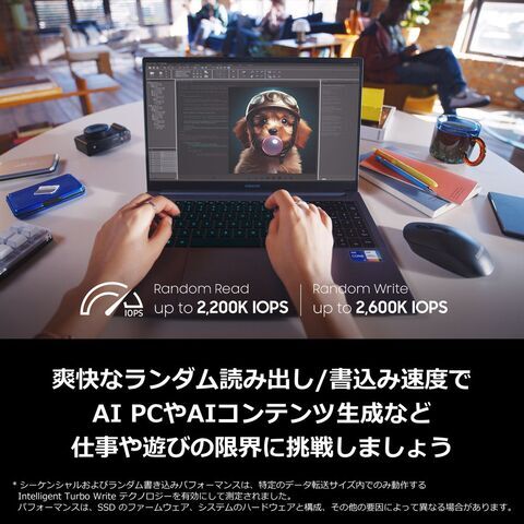 パフォーマンスは、SSDのファームウェア、システムのハードウェアと構成、その他の要因によって異なる場合があります。