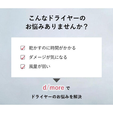 『d/more』が誕生しました。ドライヤーの一番の悩みである乾かすのに時間がかかる難点を圧倒的大風量で解決。