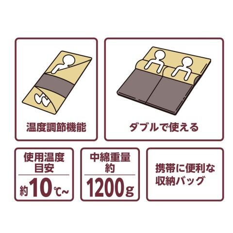 • 材質(品質): [表地]ポリエステル100% [裏地]ポリエステル100%(マイクロファイバー) [中綿]ポリエステル100%(ホローファイバー)1200g [バッグ]ポリエステル