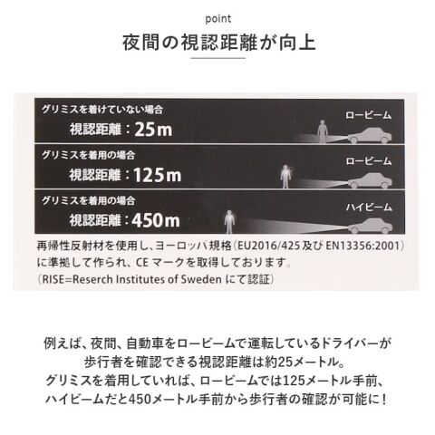 例えば、夜間、自動車をロービームで運転しているドライバーが歩行者を確認できる視認距離は約25メートル。グリミスを着用していれば、ロービームでは125メートル手前、ハイビームだと450メートル手前から歩行者の確認が可能に!