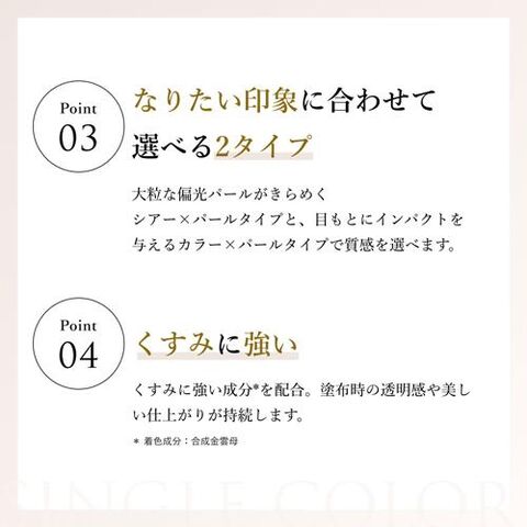 大粒な偏光パールがきらめくシアータイプと、ベースカラーが映えて目もとにインパクトを与えるカラー×パールタイプの2タイプ。