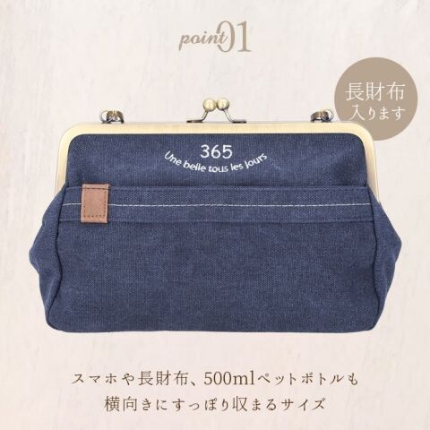 ◆パチンッと開く、昔懐かしいがま口金具がワンポイント。開口部が大きく開くから小物の出し入れが楽ちん。