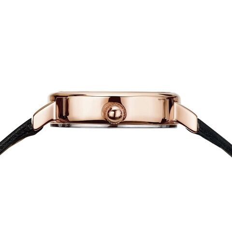 高級感のある配色に、幻想的なパール文字盤が映えます。ブラックレザーのストラップは、コーディネイトに取り入れやすく、合わせやすさも魅力です。